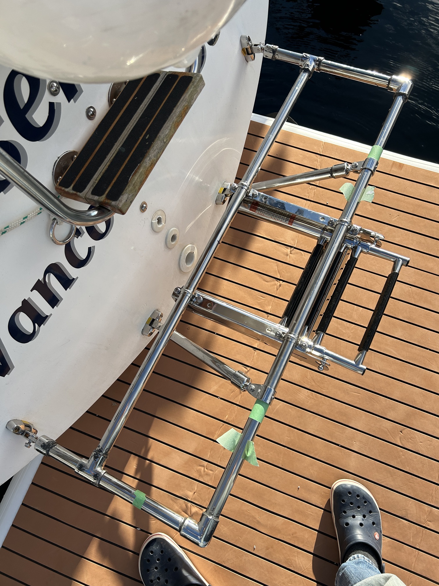 2) The telescoping latter means that a person in the water (whether intentionally or accidentally!) can easily open the ladder and get back on the platform (and the boat) even if the ladder is stowed. I find this particularly reassuring when single-handing ....