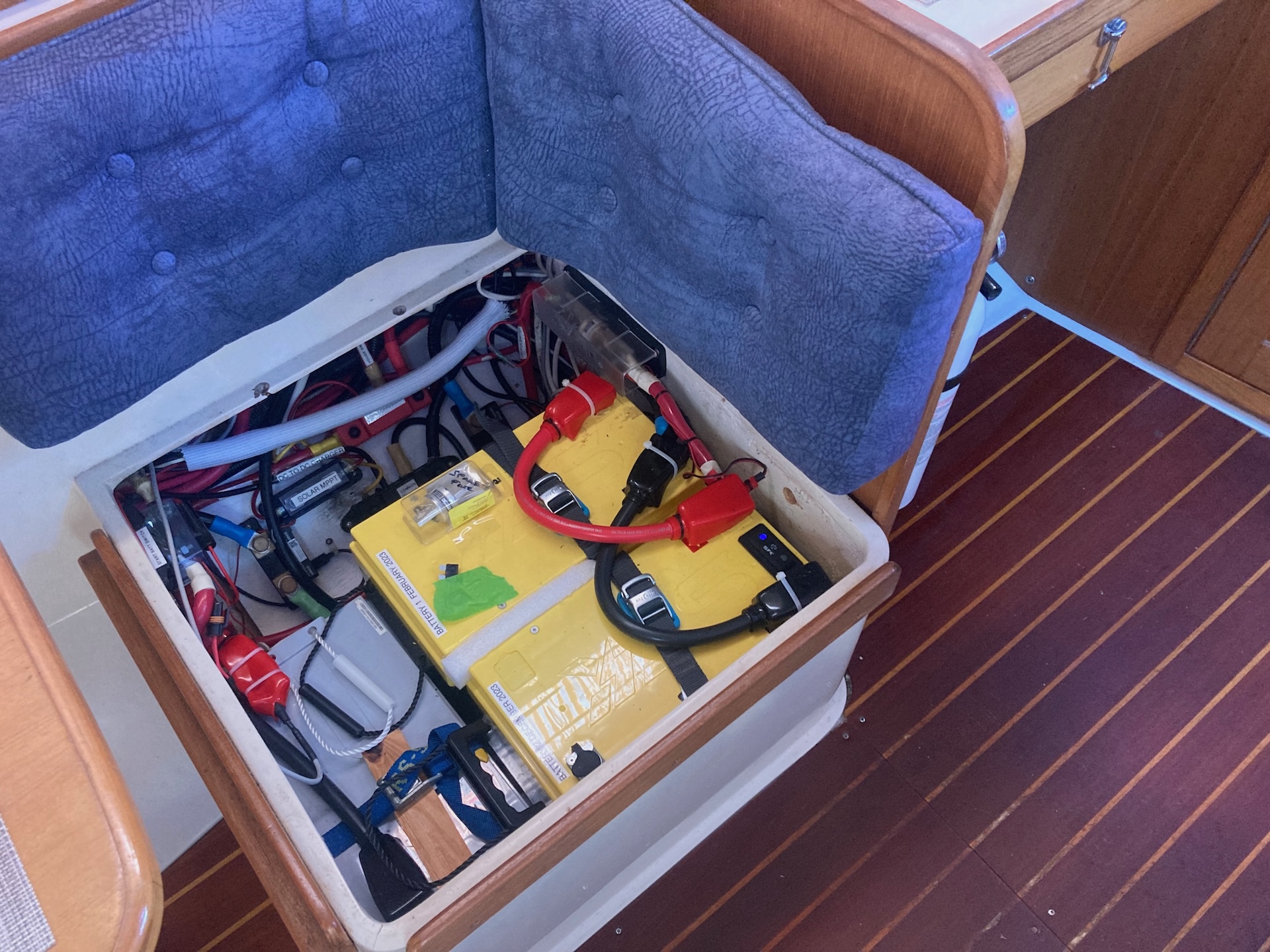 I have no idea what the original layout of that spot is (mine is effectively a fiberglass square crate/box on a platform without a lid), but I assume it's the OEM box tabbed in since I don't see any screw heads or bolts. It has places for the 2x24s inside plastic battery boxes, and not much else usable space at the moment, unless I break that box apart and remodel the space. I'm starting to look at how I can use this area more effectively, while getting a larger house bank and keeping the start battery in that location, too. I'm looking for options that allow me to do that without cutting into the gel coat of the seat the life I'd seen in some of the 6v modifications that people did. Denis's pictures show that the later boats certainly have better access to that area than the MkI does.