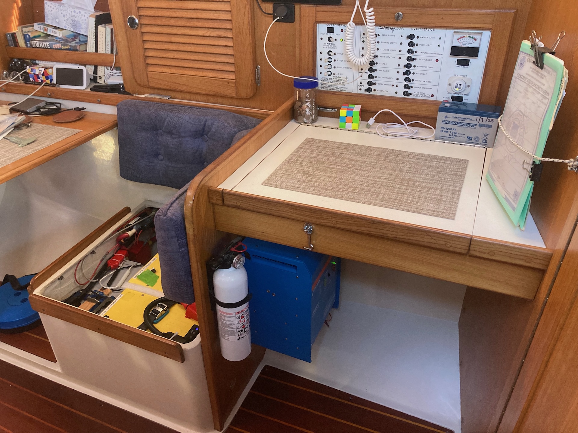 The nav station is handy for storage of small important stuff but I never used it as a nav desk. Nice as the swinging chair was it took up too much room so I removed it. Eventually I plan on using the remaining space for a galley storage cabinet.